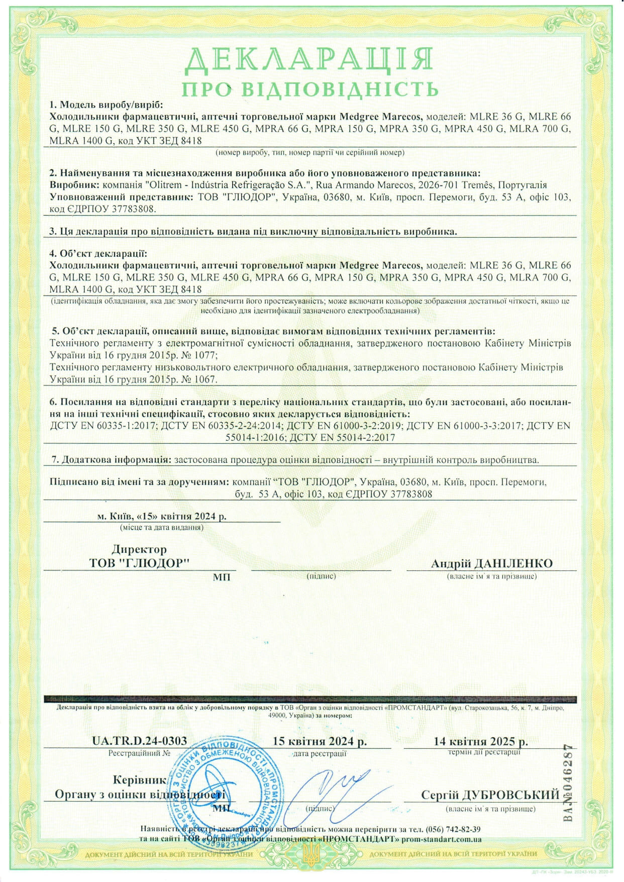 Оформлена Декларація відповідності (Декларация о соответствии) на продукцію, яка буде відповідати по формі і складу вимогам, які встановлюють Технічні регламенти в Україні