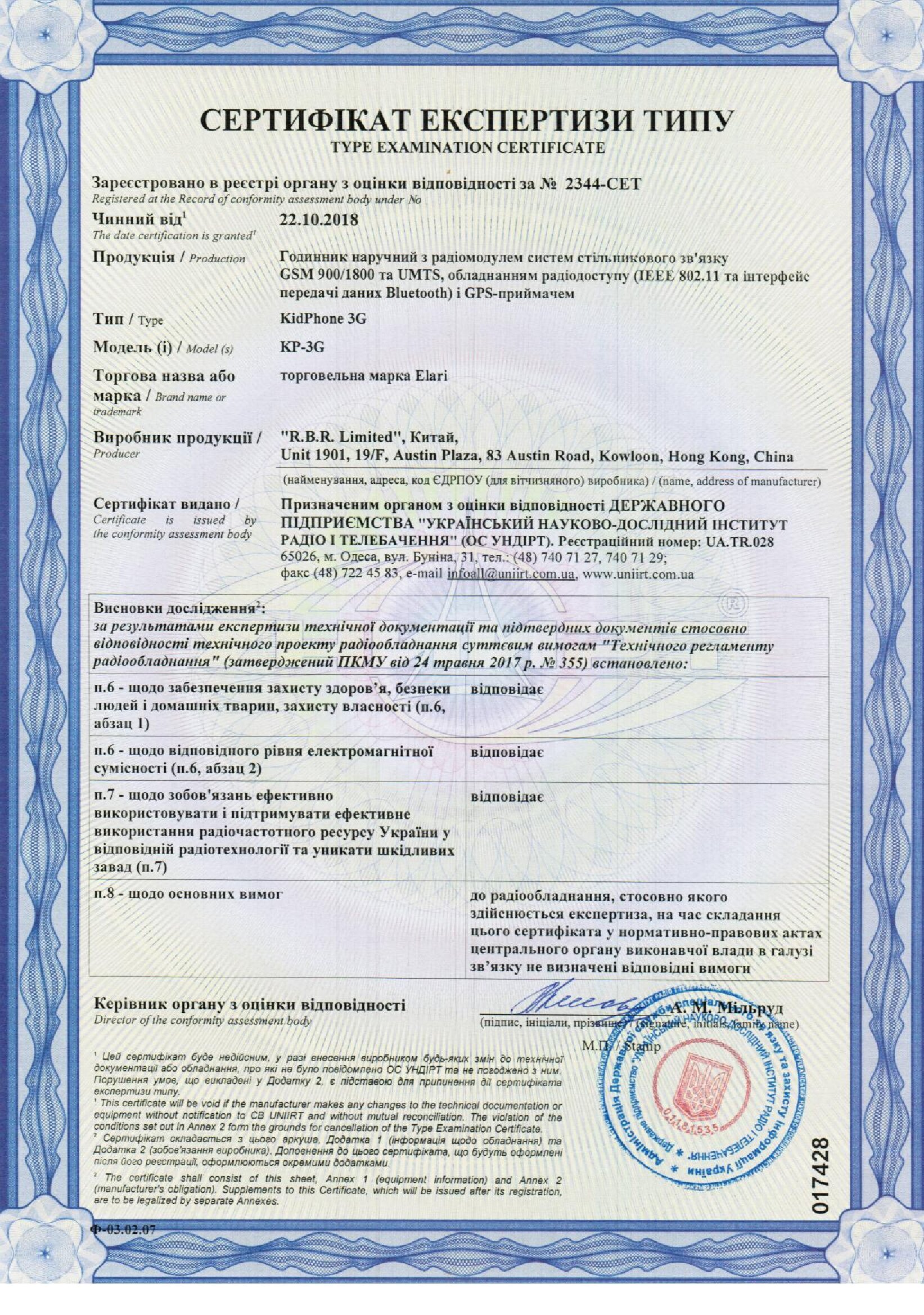 Сертифікат експертизи типу без обмеження строку - на підставі якого складається Декларація про відповідність Технічному регламенту радіообладнання (Декларация соответствия Техническому регламенту радиооборудования)