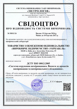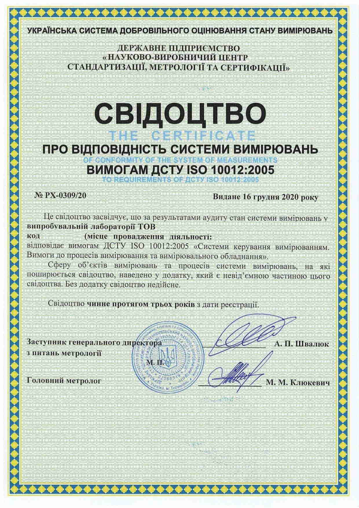 Свідоцтво ДСТУ ІСО 10012 підтверджує відповідність стандарту процесів вимірювань та вимірювального