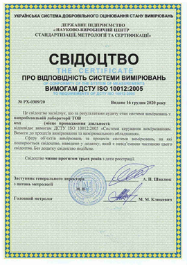 1. Свідоцтво Лабораторії про відповідність системи вимірювань вимогам ДСТУ ISO 10012:2005 терміном дії 3 роки